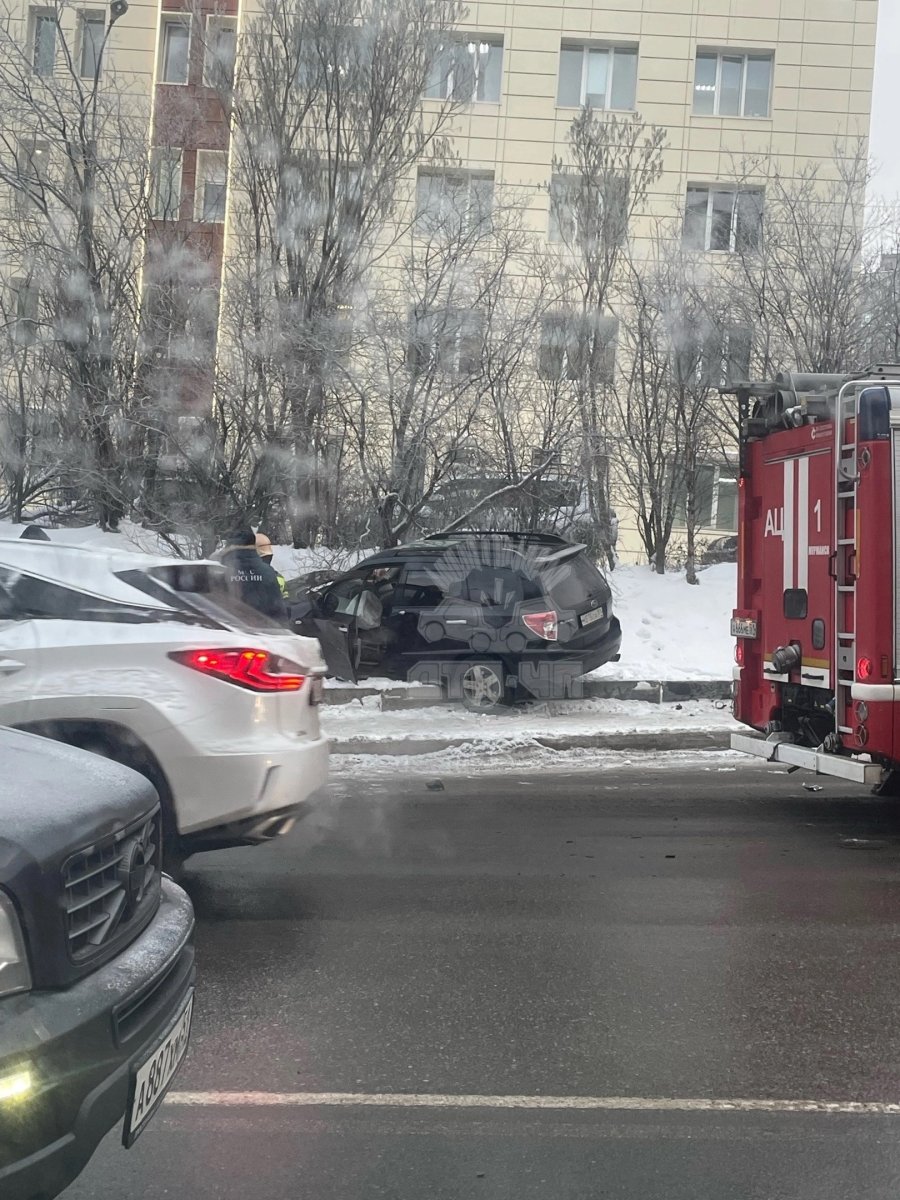 В Мурманске на улице Карла Маркса произошло ДТП с участием двух автомобилей. Водитель Mazda при совершении поворота налево не предоставил преимущество в движении автомобилю Subaru, в результате чего произошло столкновение.