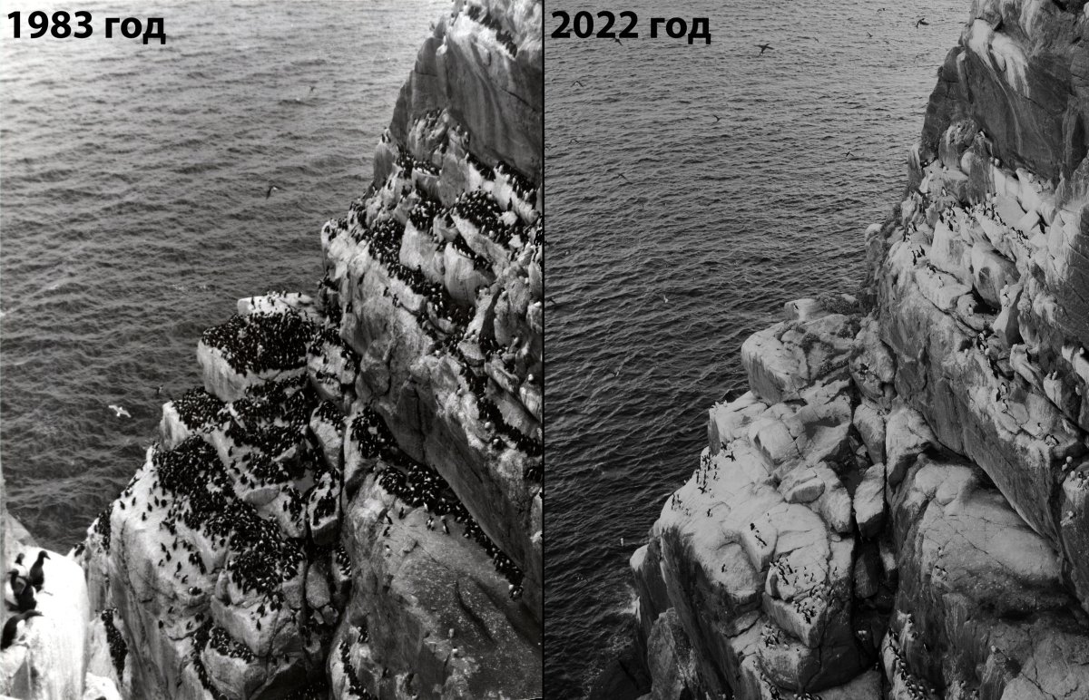 Фото: фотоколлаж Алексея Ежова. Птичий базар на острове Харлов с разницей в 40 лет. Использованы фотографии Юрия Краснова и Алексея Ежова.