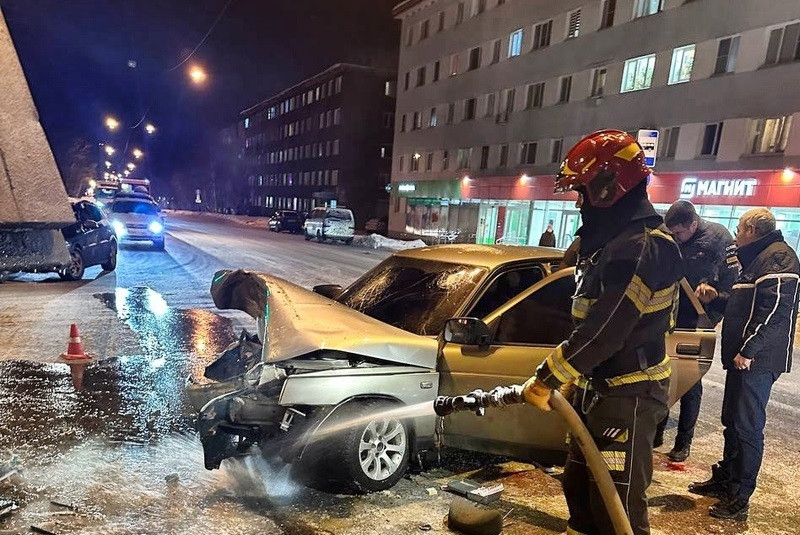 Вечером в четверг, 30 ноября, на перекрёстке улиц Лобова и Ушакова в Мурманске произошло столкновение грузовика Volvo и легкового автомобиля ВАЗ 2110 с дальнейшим разливом топлива из легковушки.