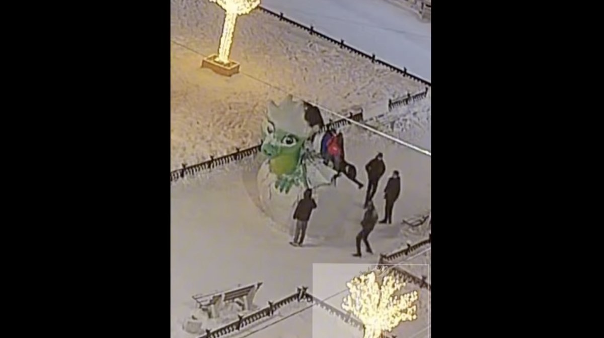 Юные жители Мончегорска пытались сломать снежную фигуру зелёного дракона. Видео разместили в группе городской администрации.