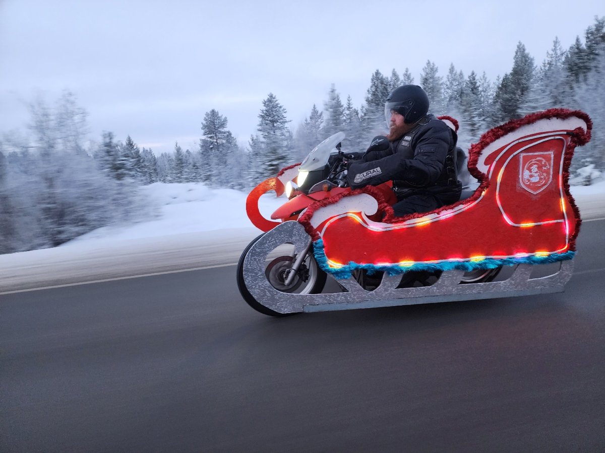 Заполярные байкеры колесят по Мурманской области и поздравляют северян с Новым годом. Мото-Дед Мороз и Зимушка-Зима путешествуют по муниципальным ёлкам и дарят подарки в обмен на стихи и песни.