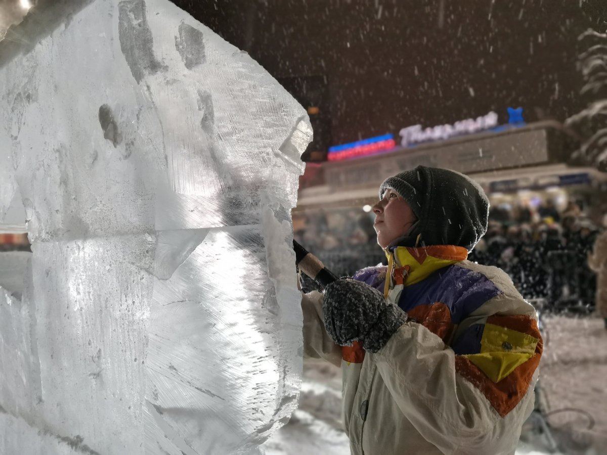 Художники-скульпторы с помощью бензопил и других подручных инструментов превратят глыбы льда в оригинальные полутораметровые ледовые композиции
