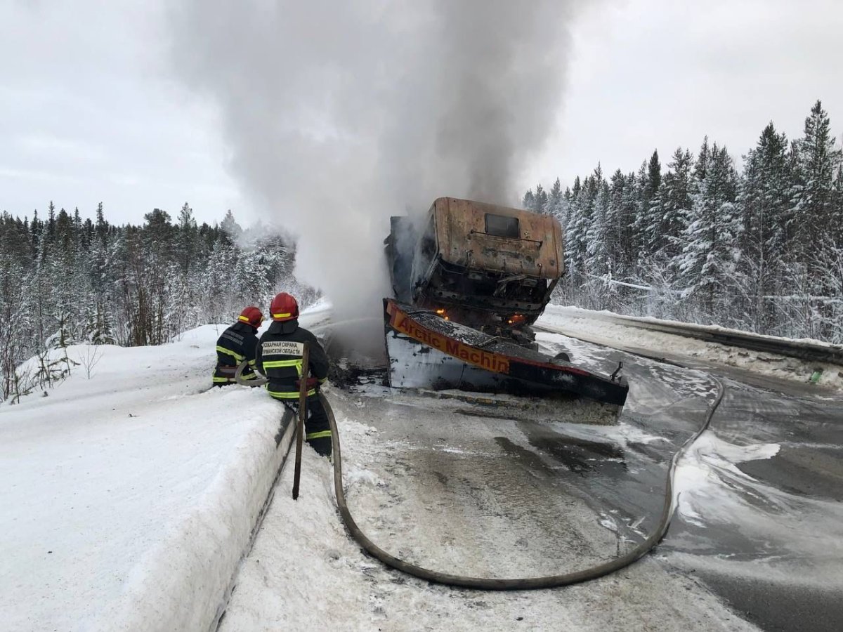 В Мурманской области на дороге под Оленегорском загорелась комбинированная дорожная машина Scania. Информация о возгорании поступила пожарным в 13:42.