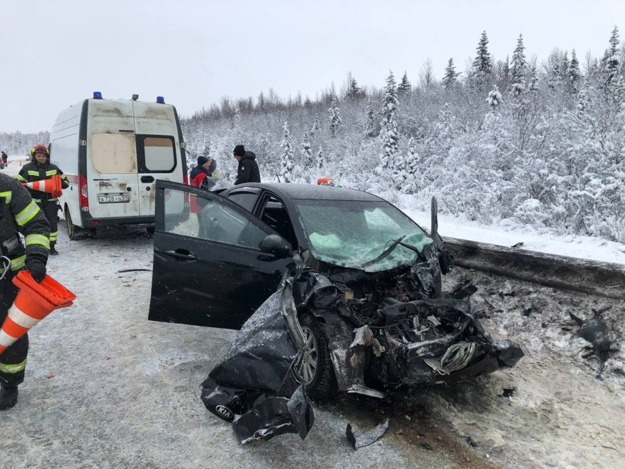 На 1295 км автодороги Р-21 “Кола” под Оленегорском легковой автомобиль Kia Rio столкнулся с автобусом Yutong. Информация о ДТП поступила в 13:17.