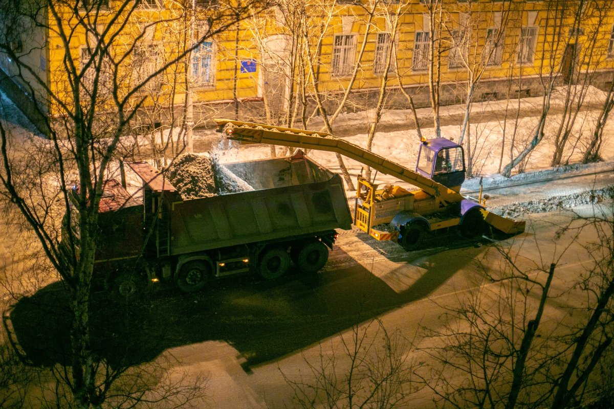 Из-за большого количества осадков в Мурманске проходит круглосуточная уборка и шнекороторная перекидка снега. Об этом сообщили в городской администрации.