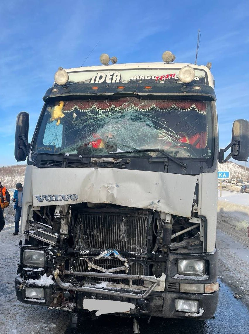 Во вторник, 20 февраля, около 11.40 в районе 9 км автоподъезда к Североморску (у озера Чайка) произошло столкновение трактора и тягача "Вольво" с полуприцепом. По предварительным данным столкновение допустил водитель гусеничной техники.