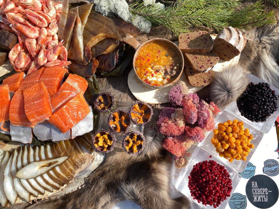 На едином столе, протяженностью более 100 метров, от Мурманской области были поданы оригинальные блюда и десерты Арктической кухни: леденцы, пастила, зефир, арктические конфеты, шоколад “Медведица”, чипсы из ягеля, снеки, варенье, соусы, ягоды, ламинарии, фукус, печень трески по-Мурмански, арктическая уха, таёжная солянка и многое другое.