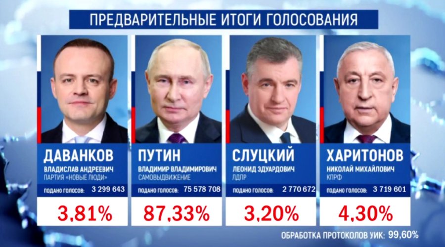 ЦИК России обработал 99,60% бюллетеней на выборах президента. Согласно информации, опубликованной на сайте избирательной комиссии, к данному часу Владимир Путин набирает 87,33% голосов.