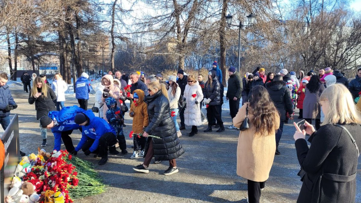 Жители города возлагают цветы у стихийного мемориала в сквере на улице Ленинградской