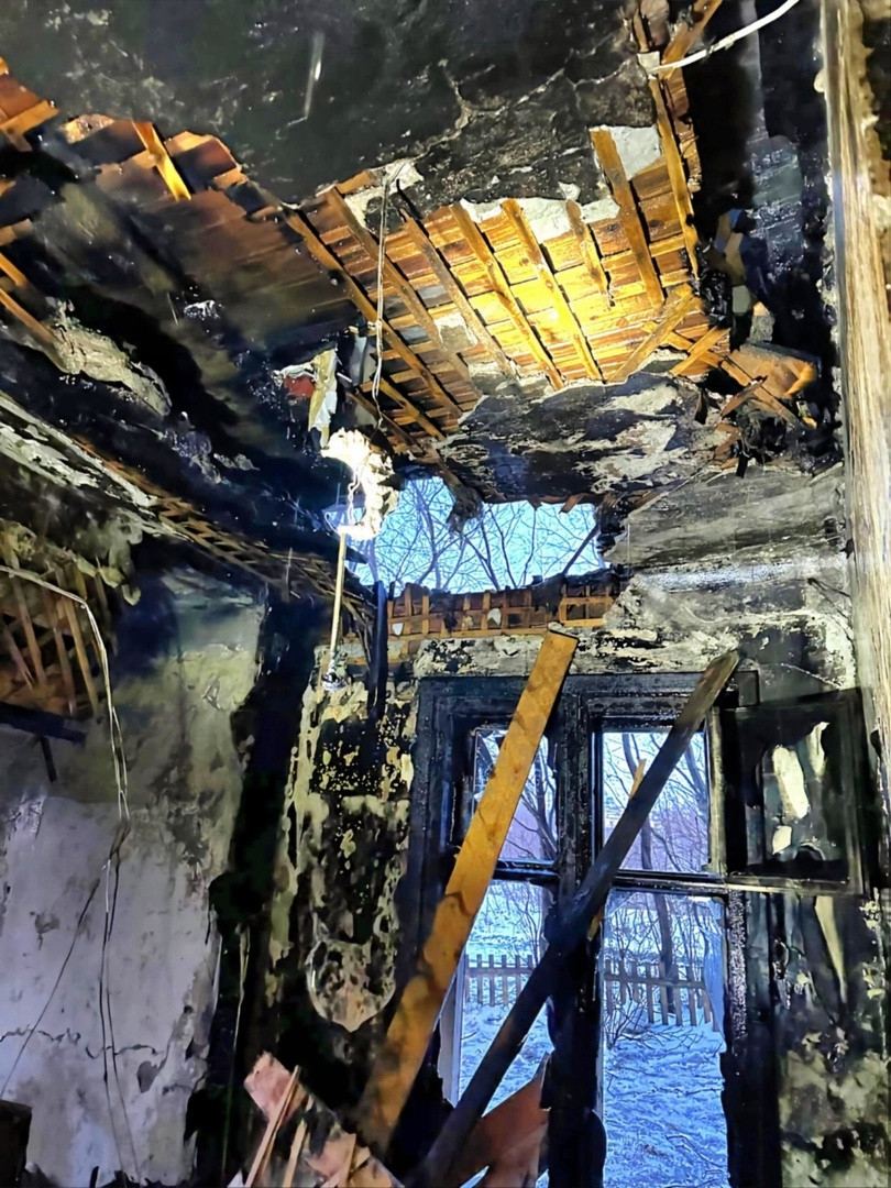 В результате пожара внутри заброшенного дома сгорели деревянные перекрытия и пол.