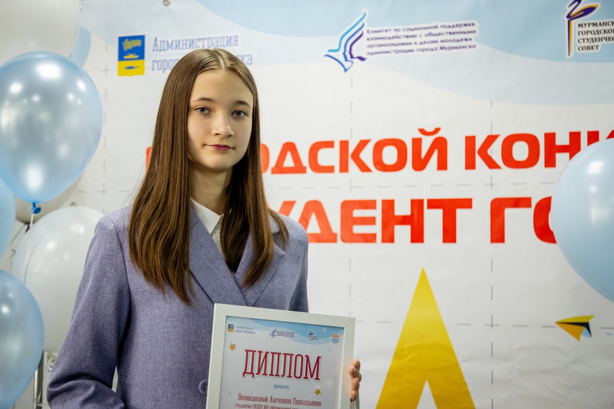 Победительницей ежегодного городского конкурса и обладательницей звания «Студент года» стала студентка Мурманского колледжа экономики и информационных технологий Ангелина Великанова.