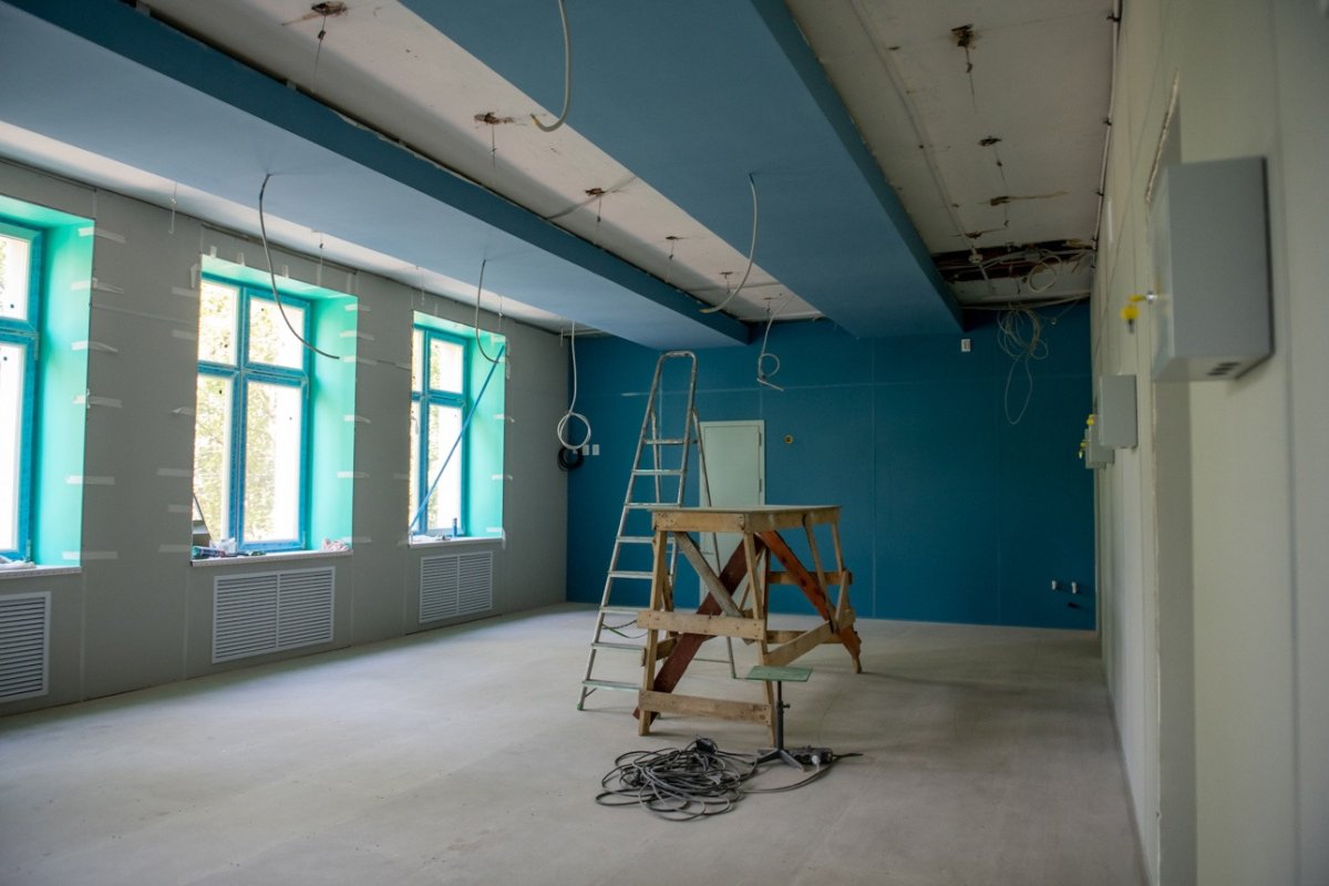 На данный момент завершены все подготовительные работы, выполнена чистовая отделка, обшивка стен, подготовка под линолеумный пол, заменены оконные блоки, противопожарные двери, система отопления с радиаторами, установлен электрический счетчик.