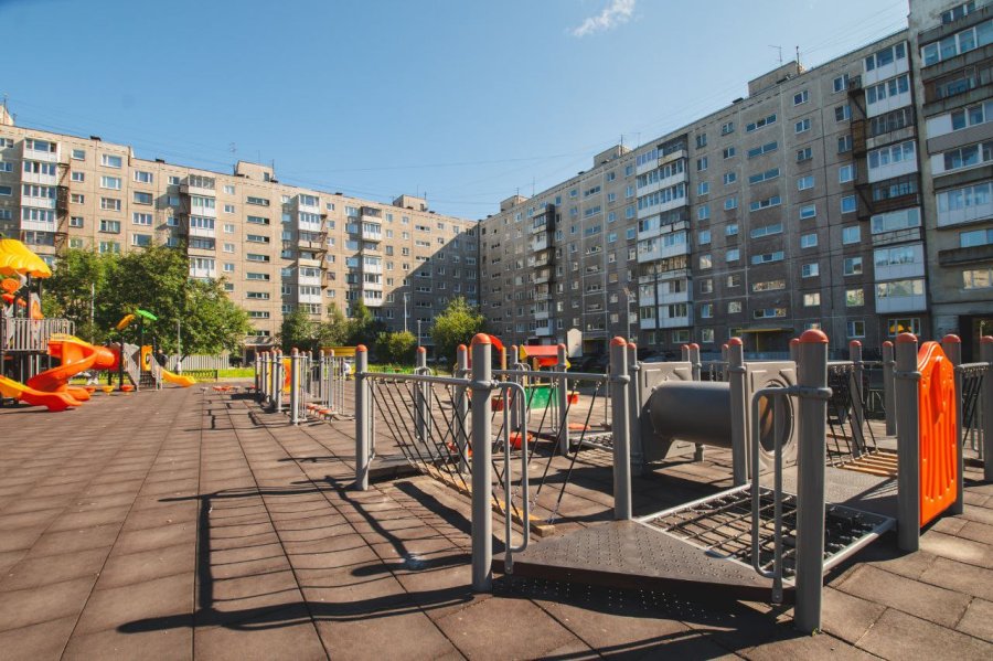 Ремонт двора и обустройство детской площадки на дворовой территории домов «91-97 на проспекте Кольском выполнены по программе «Формирование комфортной городской среды» в 2022 году.