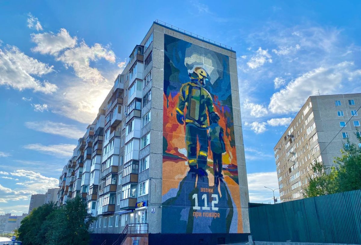 В честь 375-летия со дня образования пожарной охраны России в Мурманске на фасаде дома №3 по улице Планерная появился мурал "Огнеборец". Автором финального эскиза стал местный художник и муралист Евгений Урбанович.