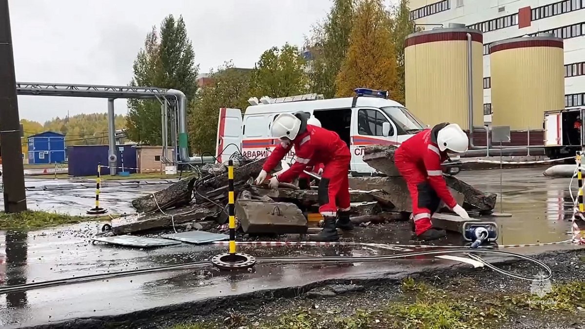 Как рассказали в ГУ МЧС по Мурманской области, в рамках учений применяется мобильная противоаварийная техника, идет разбор завалов и тушение очагов пожара, а также укрытие и вывоз персонала с промышленной площадки. Для поиска и спасения людей в задымленном помещении привлечено звено газодымозащитной службы. Пожарные эвакуируют двух сотрудников станции, не сумевших самостоятельно выбраться из аварийной зоны. Скорая помощь доставляет пострадавших в больницу.