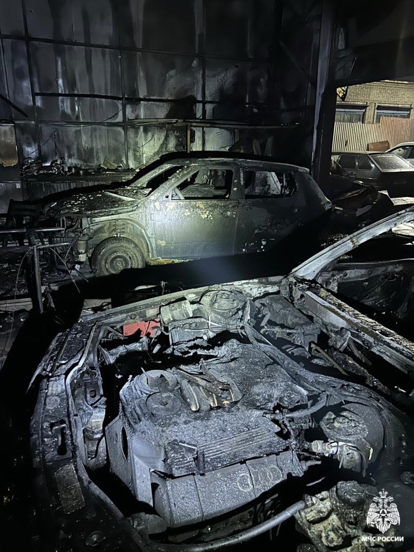 В результате происшествия огнём уничтожены автомобили Audi и Skoda, закопчены семь машин, стены и потолок помещения на площади 150 кв. метров.