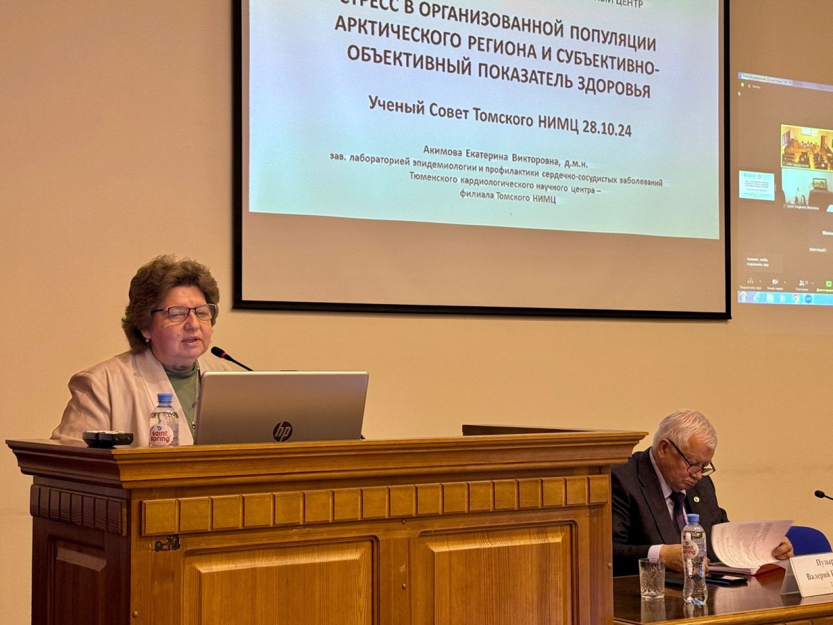 Доктор медицинских наук, завлабораторией эпидемиологии и профилактики сердечно-сосудистых заболеваний Тюменского кардиоцентра – филиала Томского НИМЦ Екатерина Акимова представила на заседании Учёного совета доклад "Стресс в организованной популяции Арктического региона и субъективно-объективный показатель здоровья". В докладе были представлены новые уникальные результаты изучения психосоциальных факторов риска сердечно-сосудистых заболеваний у мужчин в возрасте 25-54 года, работающих вахтовым методом, в Арктическом регионе России.