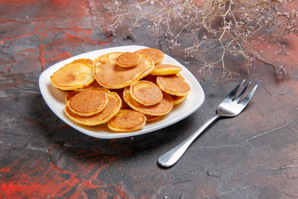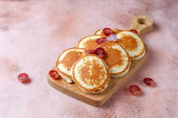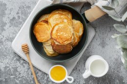 Готовые оладьи выкладываем на тарелку и подаем со сметаной/йогуртом/медом. Можно добавить фрукты или ягоды.