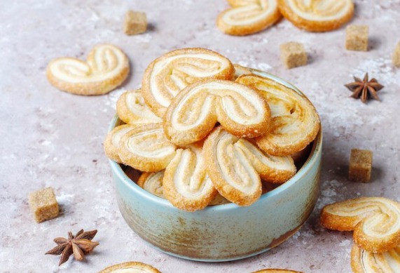 Каждый кусочек нужно обвалять в сахаре, сложить пополам, затем ещё раз таким же образом и слегка прижать. Полученные заготовки можно выложить на противень, предварительно застеленный пергаментной бумагой.