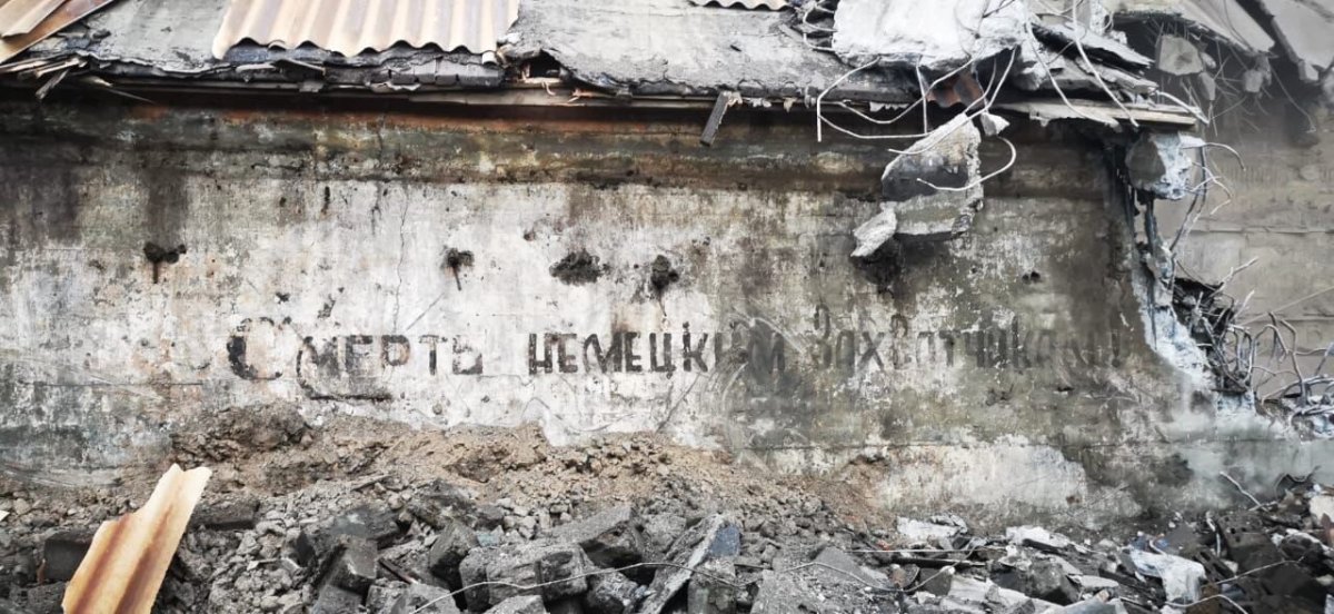 Надпись ранее была закрыта кирпичной кладкой, ее стало видно при сносе здания. По распоряжению руководства Кольской ГМК работы на этом участке оперативно остановили.