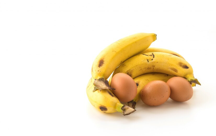 Возьмите парочку бананов, столько же яиц, четыре столовые ложки какао и половину ложки разрыхлителя.