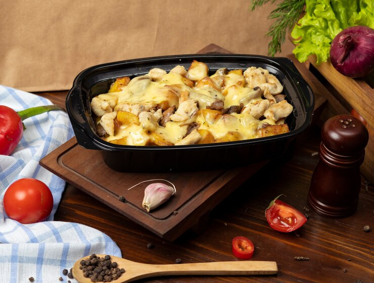 А потом вот так, с кефиром, кладем в форму, в которой будем готовить, прикрываем фольгой и ставим в духовку на час. Нагреться духовка должна до 200 градусов.