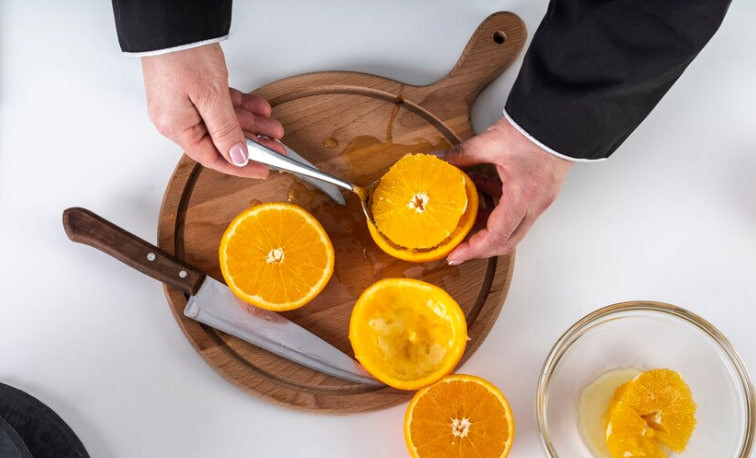 Для соуса: 2 средних апельсина, 50 мл кипятка (можно взять куриный бульон), 50 мл белого сухого вина, 1 чайная ложка яблочного уксуса, 25 г сливочного масла, 1 чайная ложка пшеничной суки, 2 чайные ложки мёда, соль и перец.