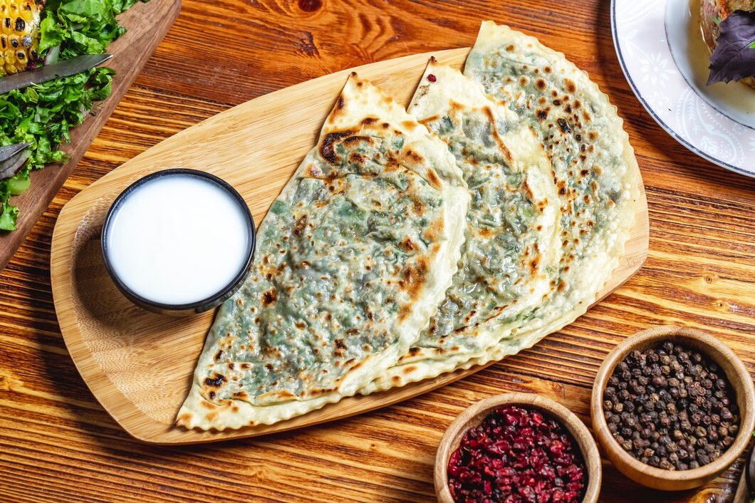 Для начинки можно взять любую зелень — петрушку, кинзу, зеленый лук. Также в составе лепешек встречаются брынза или любой мягкий сыр с зеленью, мясной фарш, творог и тыква. В этом рецепте используют сыр кавказский, можно добавить феты для солености.