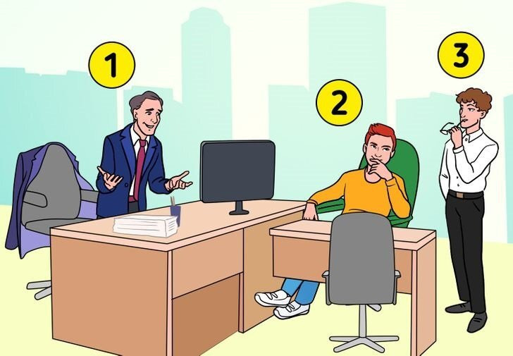 Но на спинке кресла за его спиной также накинут похожий элемент офисного костюма. Вряд ли этот человек ходит в двух пиджаках одновременно или меняет их на своем рабочем месте. Человек номер два одет в джемпер. Скорее всего, спорный предмет одежды не может принадлежать ему. А вот мужчина под номером три явно свой пиджак скинул, оставил его на своем рабочем месте — месте начальника и оказался в рубашке. В задумчивости или в пылу какого-то рабочего обсуждения он перемещается по кабинету. Так же, как его собеседник, оказавшийся за столом. Поэтому делаем выводы, что начальником является человек под номером 3.