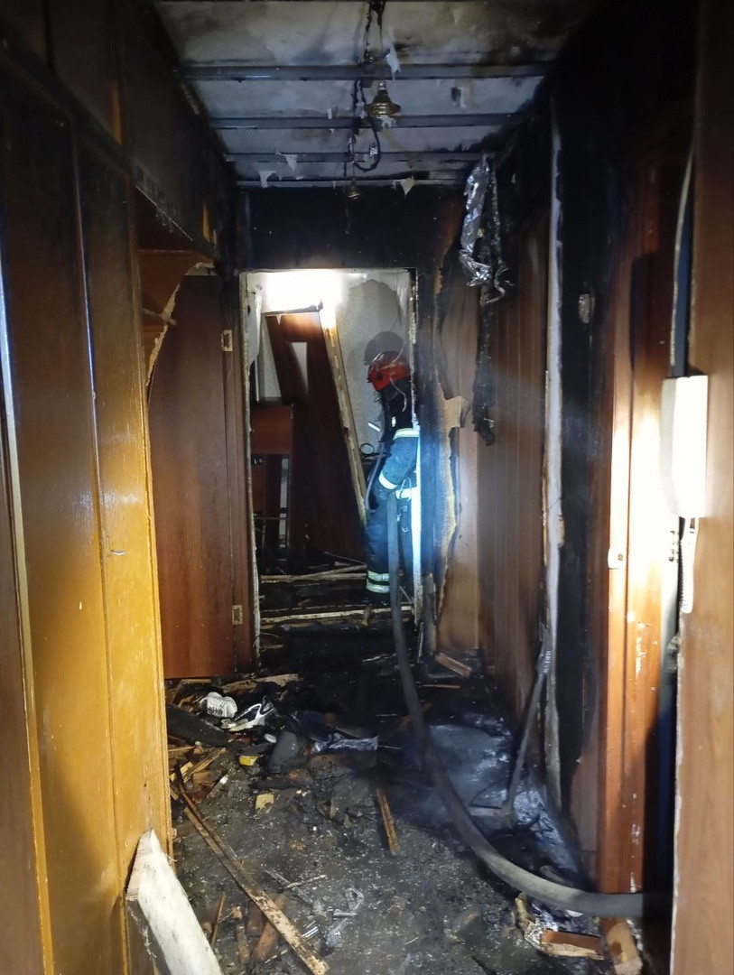 Огонь повредил электрический щит на лестничной площадке первого этажа, закопчены стены и потолок по всей площади. Возгорание перекинулось на двухкомнатную квартиру на втором этаже, где загорелось напольное покрытие на площади два кв. метра. Вскрыто напольное покрытие и разобран встроенный шкаф в прихожей. Огнём также повреждены натяжные потолки во всей квартире, межкомнатная дверь, мебель в прихожей, стеновые панели. Квартира закопчена по всей площади. Использовались дымосос, бензопила и тепловизор.