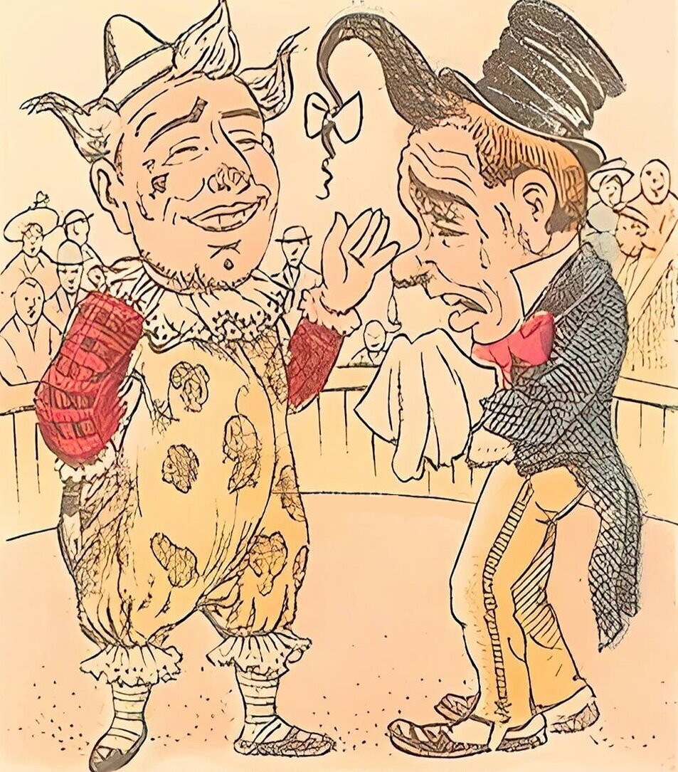 Не трудно догадаться, что животное завуалировано в деталях одежды, но найти его сложно. Первым на ум приходит, что свинка нарисована на широких штанах одного из клоунов, но там видим лишь мышь. Настает черед второго клоуна — и тут мы видим, что очертания его носового платка под нужным углом напоминают голову свинки с характерным пятачком.