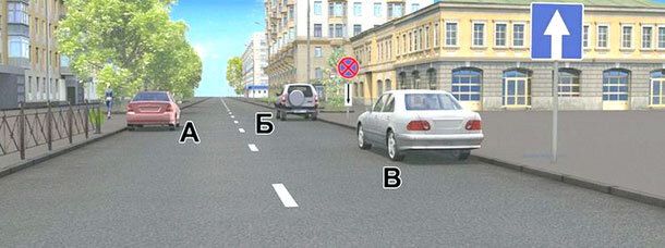 Водитель автомобиля Б также не нарушил, потому что стоит за знаком.