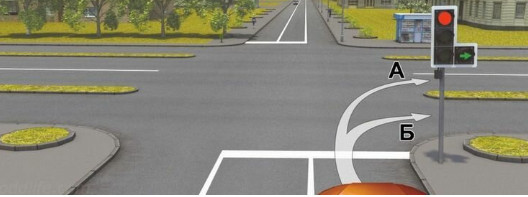 Получается, что автомобилист может повернуть направо под дополнительную секцию, однако возможно это сделать по траектории Б. Если же сделать это по траектории А, следует проехать прямо и только потом совершать манёвр. При этом ехать прямо — запрещается.