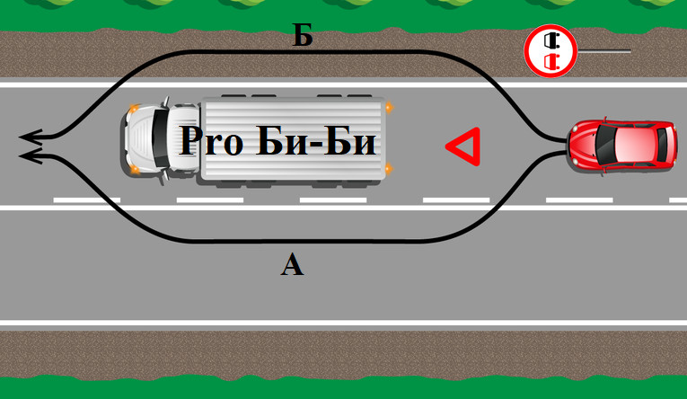 Траектория Б нам не подходит, за езду по обочине можно получить штраф в размере 1500 рублей. И остается только траетория А. В данном случае, это не будет считаться обгоном, а знак у нас именно «Обгон запрещен».