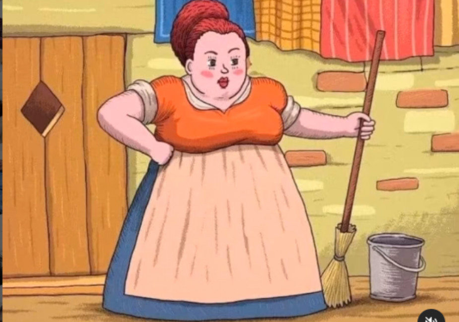 Присмотритесь, что вы видите на изображении: шикарная дама с метлой и ведром на фоне кирпичной стены, скорее всего, печи. За спиной дверца и занавески.