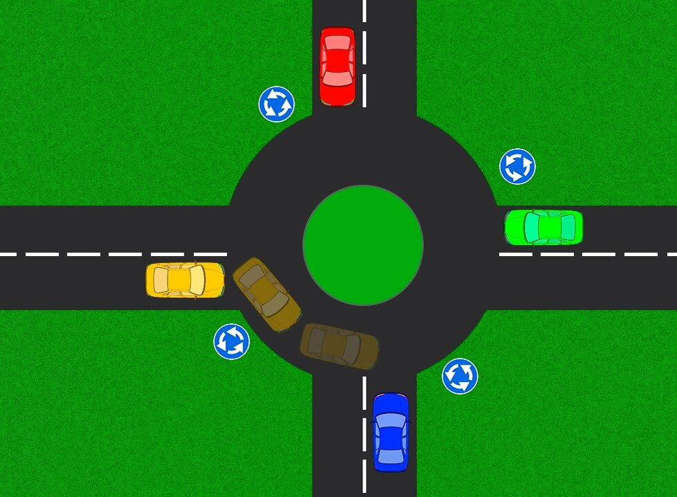 Вопрос: должен ли водитель синего автомобиля пропустить своего желтого собрата? Вспоминаем пункт 13.11 правил дорожного движения. В нем говорится, что водитель транспортного средства, который собирается выехать на перекресток с круговым движением, Обозначенный знаком 4.3 «Круговое движение» обязан пропустить все транспортные средства, которые уже двигаются по перекрестку.