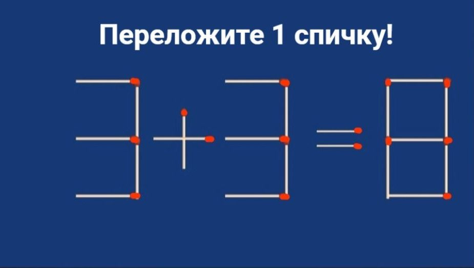 Эту головоломку со спичками возможно решить тремя способами. На это дается 1 минута. Итак, дано неверное равенство: 3 + 3 = 8. Можно переложить только одну спичку во всех трех вариантах решения.