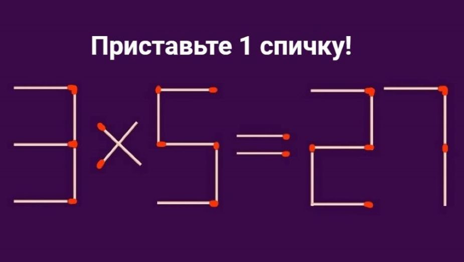 Пример 3 + 5 = 27 неверный. Его решение зависит от вас — нужно приставить только 1 спичку, чтобы получилось верное равенство.