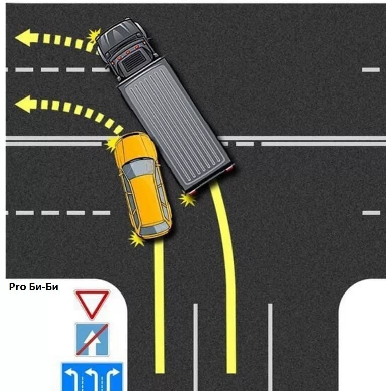Чтобы избежать аварии, грузовой автомобиль должен был взять больший угол поворота. Поскольку каждый автомобиль поворачивал в свой ряд, для легковушки помехи справа не было, и уступать дорогу он не должен был.