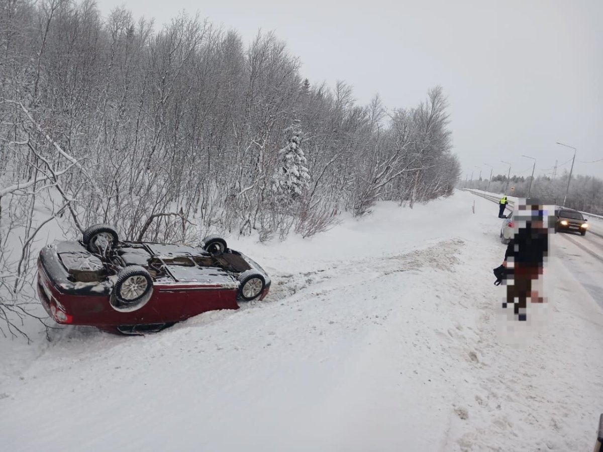 В Мурманской области на 6 км автоподъезда к аэропорту Мурманск произошло ДТП. Автомобиль Volkswagen Jetta съехал в кювет и перевернулся на крышу.