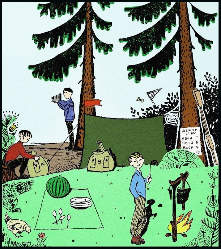 Теперь нужно разобраться с оставшимися двумя мальчиками. На картинке мы видим только одного. Он готовит еду. Присутствие еще одного угадывается по виднеющемуся за кустами сачку. Юный любитель природы ловит бабочек. Смеем предположить, что это Шура. Почему? Потому что, согласно графику дежурств, Шура дежурит в последний день. Как понять, что день не последний? По неразрезанному арбузу. Сложно предположить, что мальчишки, собираясь в обратный путь, отведают этого мочегонного лакомства. А значит съесть они планируют его сегодня.