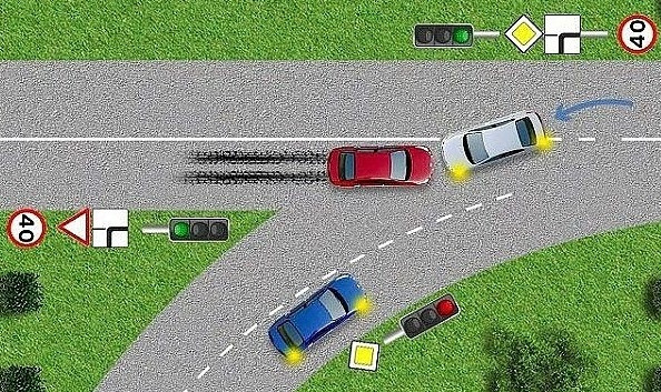 На рисунке мы видим ДТП. На перекрестке столкнулись водители серого и красного автомобилей. Оба двигались на разрешающий сигнал светофора. Водитель серой машины поворачивал налево, а водитель красной ехал прямо.