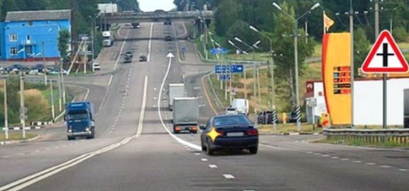Кроме того, установлен знак, указывающий на то, что мы стоим на главной магистрали. Отметим, что на выбранном участке — две полосы движения, а значит опережение сразу двух грузовых транспортных средств выполнить позволительно.
