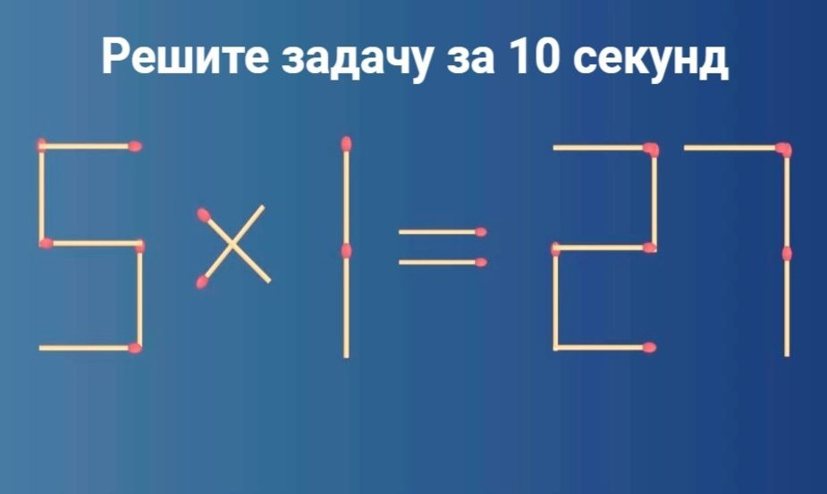 Итак, что нужно сделать. Перед вами пример: 5×1 = 27. Тут нужно переставить две спички таким образом, чтобы равенство стало верным. Конечно, нельзя назвать такую задачу очень сложной, но поразмыслить придётся. Только делать это нужно быстро — у вас всего 10 секунд.