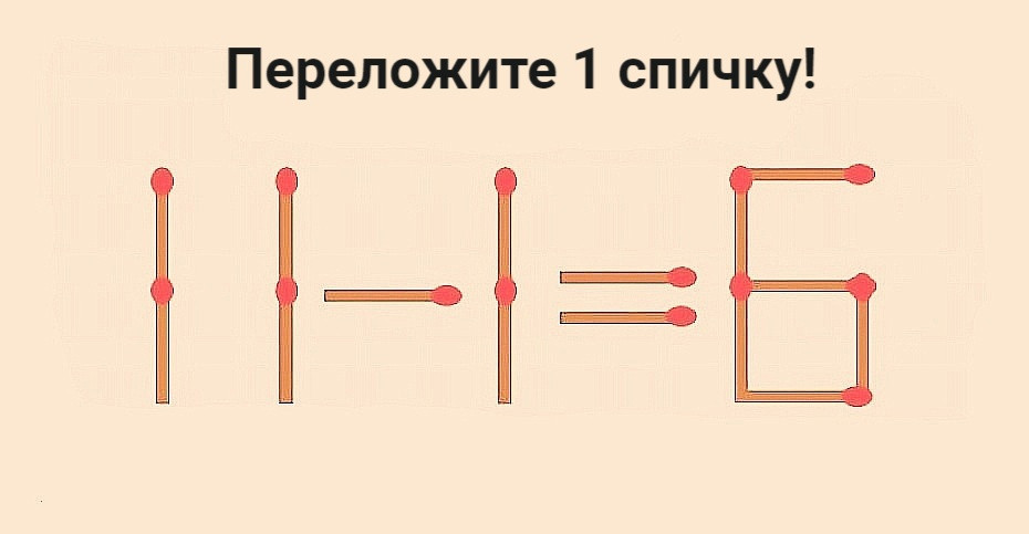 Все, что нужно, это сделатьпример 11-1=6 правильным, переставив одну спичку на другое место. На решение задачки дается 12 секунд.