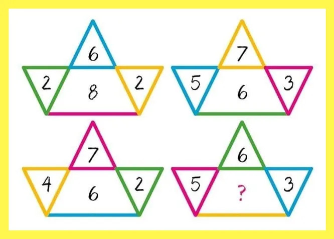 Число из верхнего треугольника необходимо уменьшить на число из треугольника слева и умножить получившийся результат на число из треугольника справа. Таким образом, в основании четвертого треугольника появляется цифра 3.