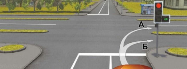 Некоторый делают вывод, что поворот доступен на любой траектории. Однако это не так. Дело в том, что в этом случае мы можем повернуть направо под дополнительную секцию лишь по траектории Б. А если провернуть манёвр по траектории А, то нужно сначала проехать прямо, но это нам запрещено.