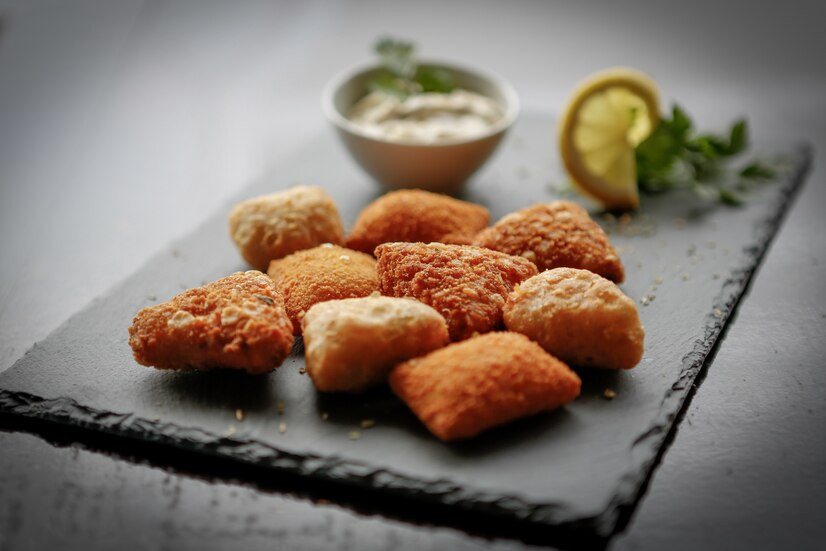 Филе хорошо промыть и обсушить, нарезать на небольшие кусочки, по размеру напоминающие наггетсы или чуть больше.
