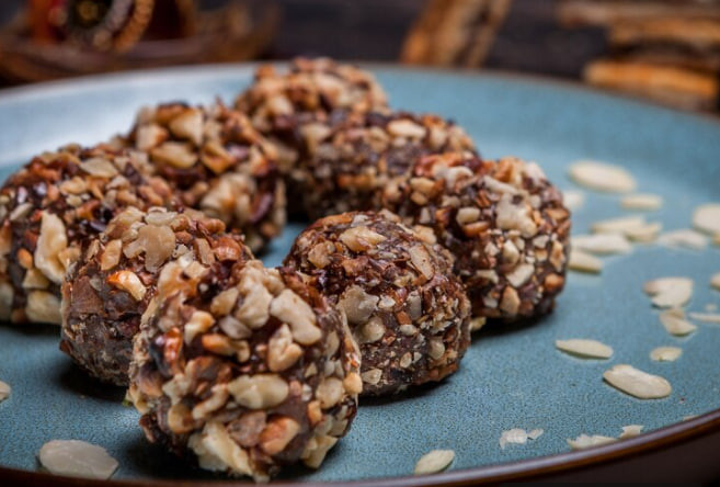 Соединяем в блендере орехи с финиками, измельчаем их до однородности. Кладём в смесь овсянку и перемешиваем, формируем конфеты. Добавляем растительное масло к шоколаду, растапливаем.