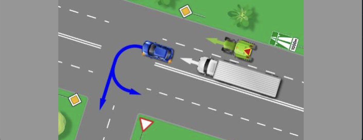 Взгляните на картинку: трактор двигается по правой полосе, грузовик едет по левой, а автомобиль хочет повернуть налево.